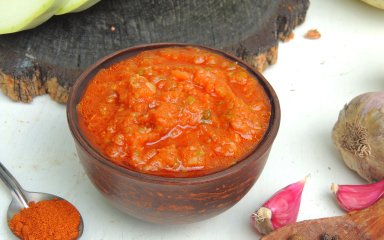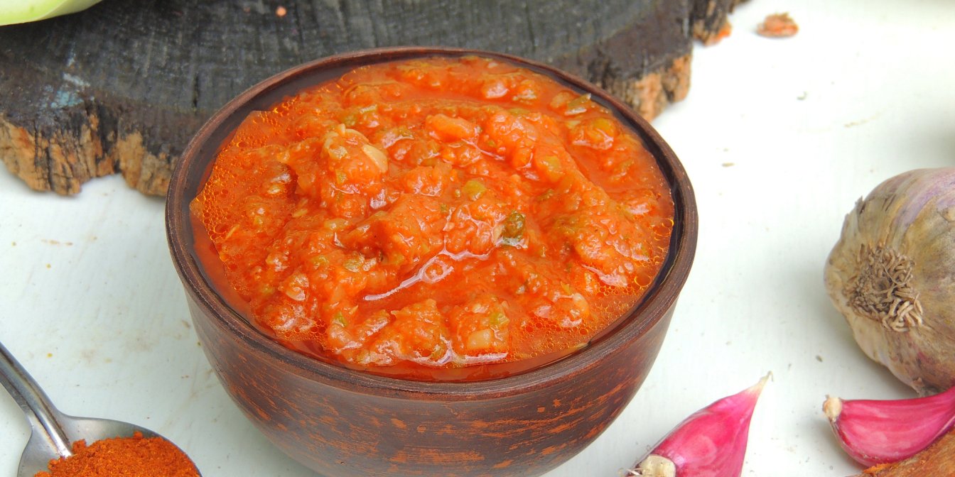 Достать специи и пробить кабачки с луком блендером до однородности. Затем добавить перец чили, сахар, томатную пасту, уксус в кабачки и проварить еще 10 минут. Имейте в виду: когда соус начнет кипеть, он очень сильно брызжет, поэтому накройте его крышкой или ситом, чтобы потом не мыть кухню.