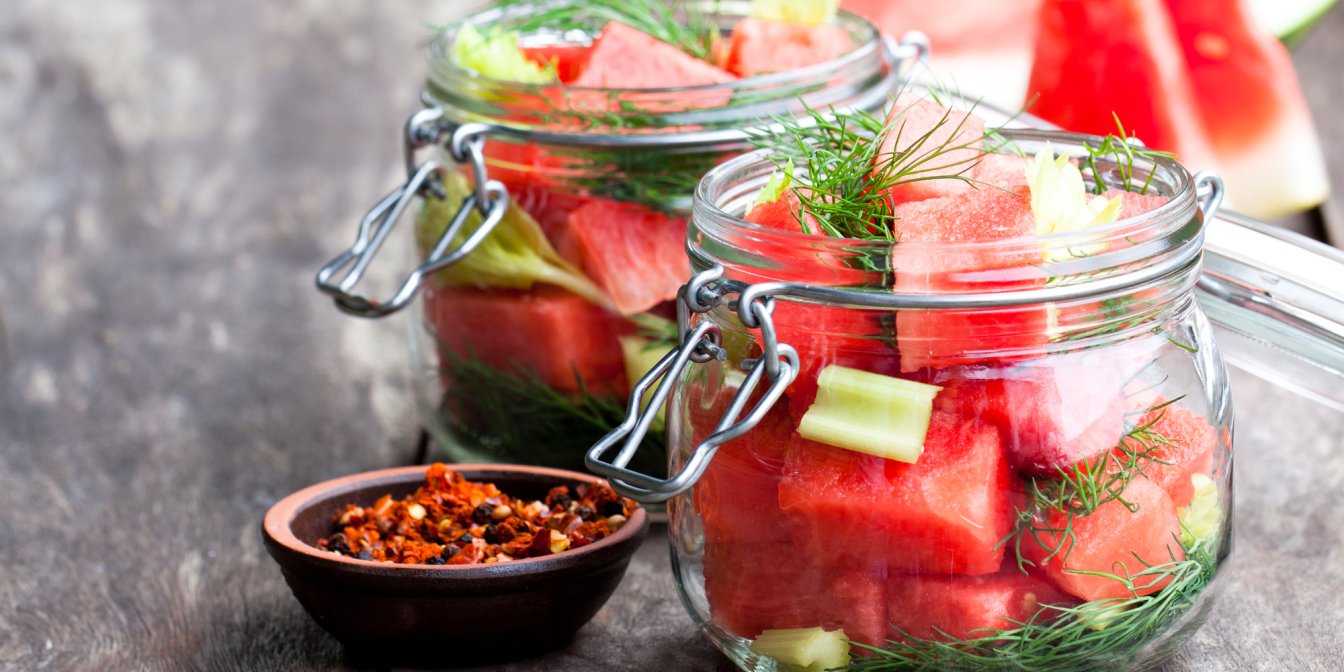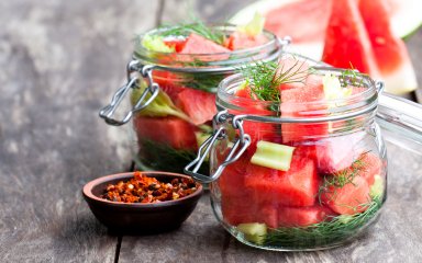 На что будет похожа по вкусу закуска-соленье из арбузной кожуры? Нам она напомнила хрустящие и упругие соленые огурцы. Нам нужно 900 г кожуры, а это примерно 2-3 средних арбуза. Из мякоти готовь арбузное смузи — никаких отходов!