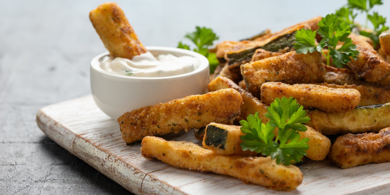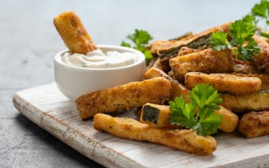 Очень простой и быстрый рецепт баклажанов фри, а также дипа к ним, который готовится из обычных доступных ингредиентов, приводит кулинарный канал Ricette Perfette. Обратите внимание на удобный способ, как покрыть баклажаны кляром, ведь эту идею можно применять для любых жарящихся в тесте ингредиентов.