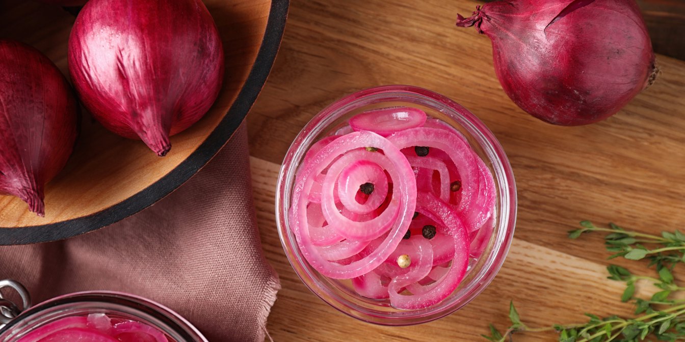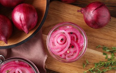 Такой маринованный лук готовится за считанные минуты из простейших ингредиентов, которые есть на каждой кухне. Его можно есть просто так, а можно добавлять в салаты, к рыбе и мясу на гриле или подавать к соленой селедки или утренним бутербродам с домашним кремом-сыром и слабосоленым лососем.