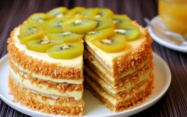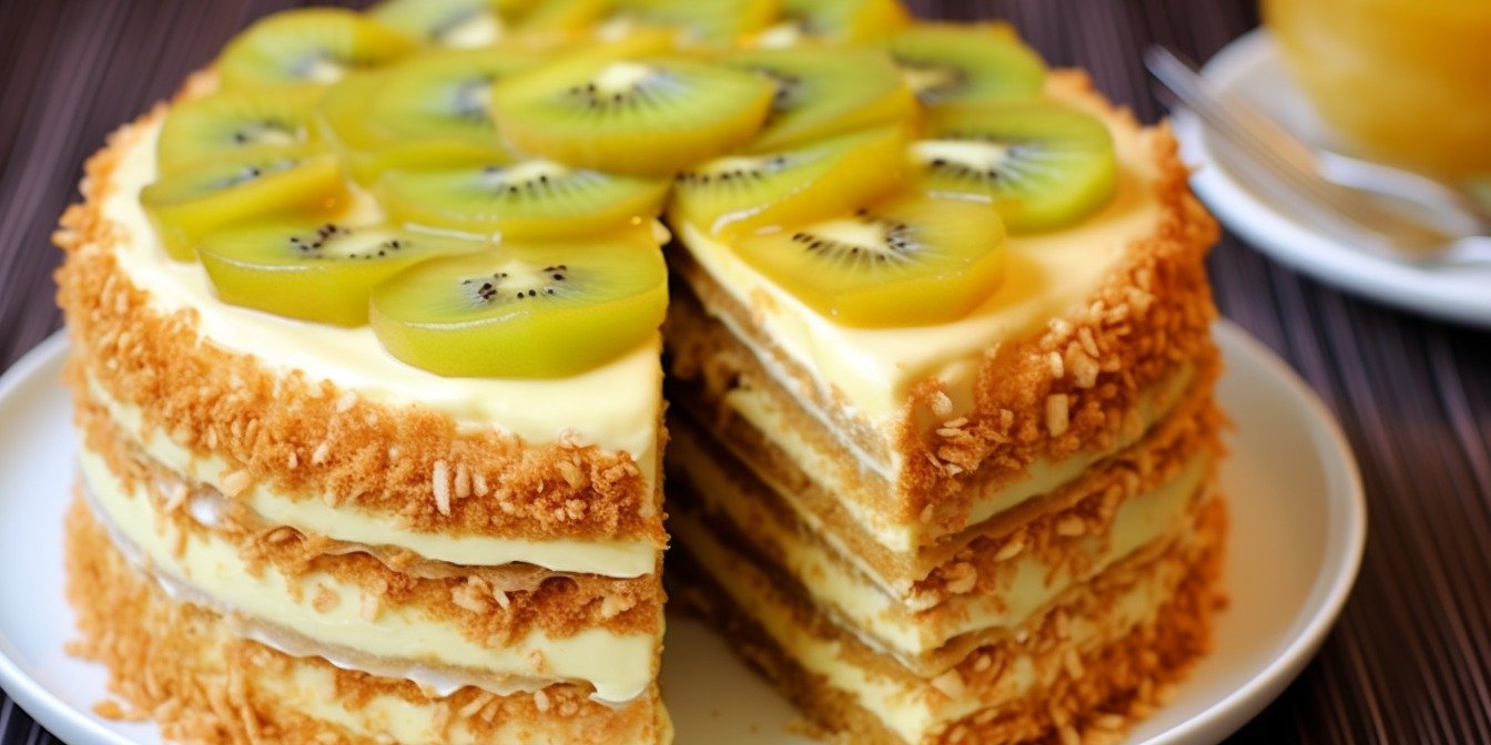 Это не совсем привычный медовик. Для крема берем сливочный сыр и сметану, а коржи перекладываем тоненькими кусочками киви. Поверьте, это очень вкусно!