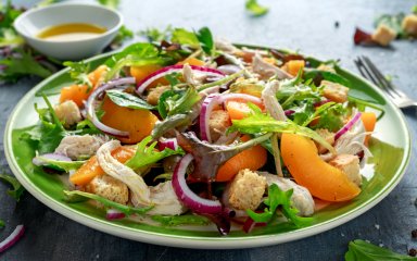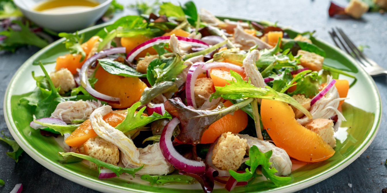 В этом легком салате с курицей и персиками сочетается сразу несколько оттенков вкусов: сладость персика и меда, пряность горчицы и нежность курицы. Если любишь различные салаты с курицей, то этот тебе понравится. Куриное филе используем вареное, запеченное или копченое.