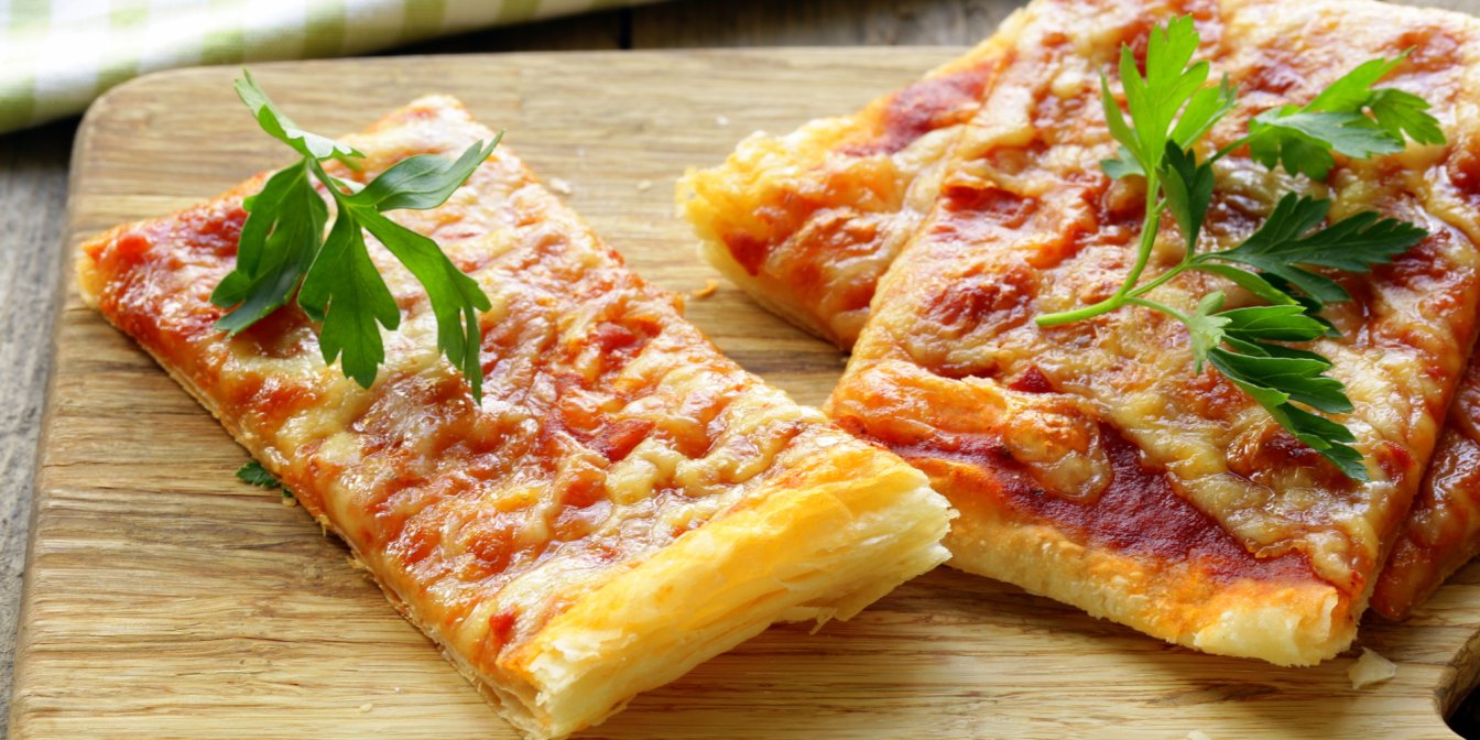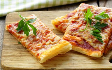 Слоеная пицца, испеченная из готового магазинного теста, — сытный и интересный вариант быстрой домашней закуски или перекуса. Для удобства сделайте ее в порционном формате.