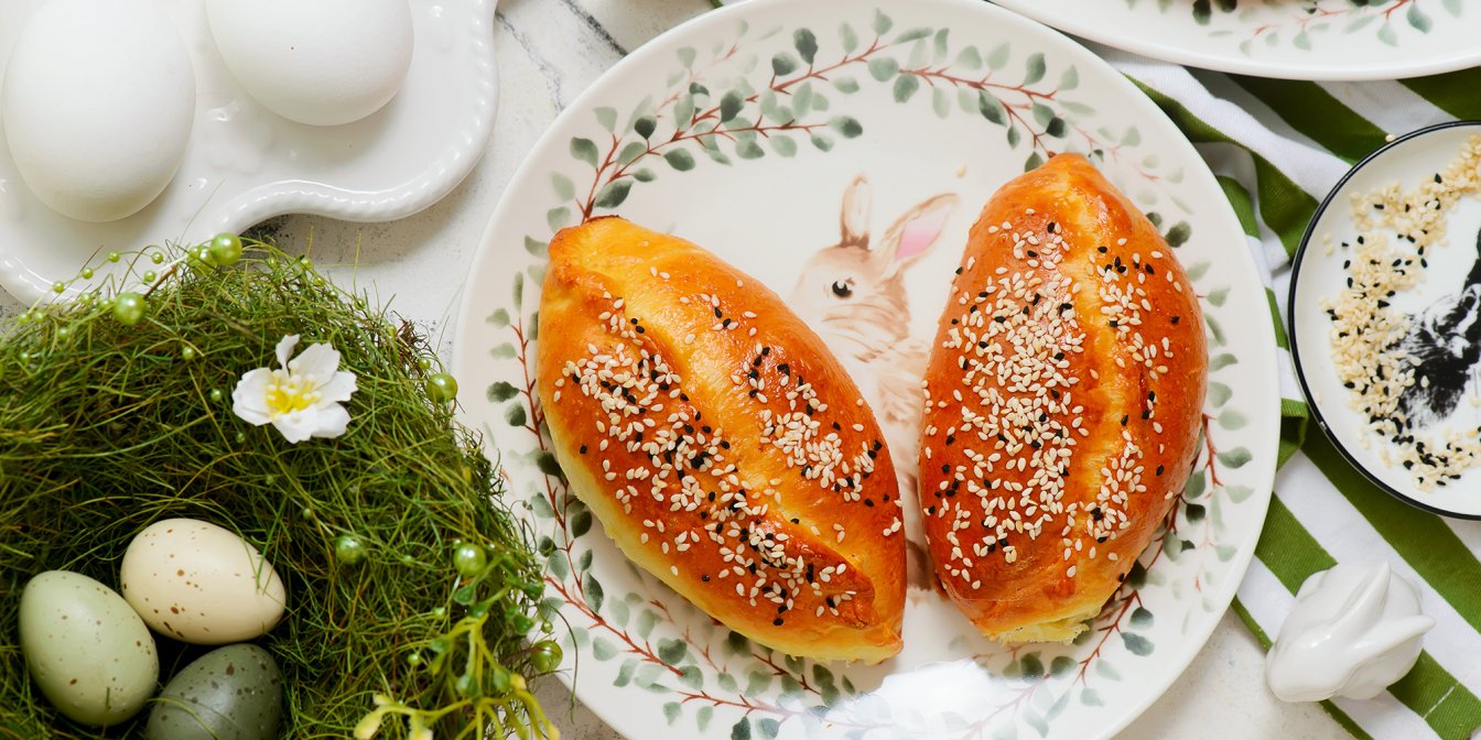 Хорошо залепите шов. Выложите пирожки на застеленный пергаментной бумагой противень, накройте и дайте подойти в течение 20 минут. Затем смажьте пирожки взбитым яйцом и присыпьте кунжутом.