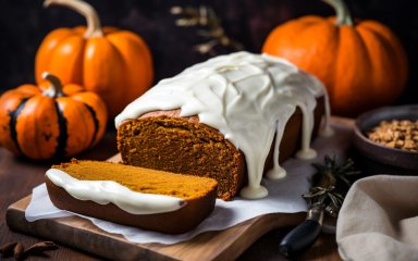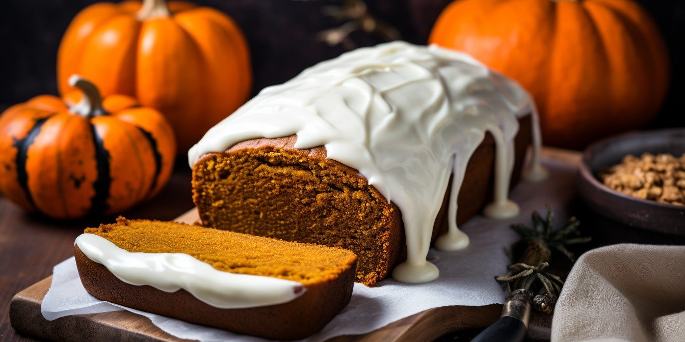 Для глазури соедините все ингредиенты и взбейте их венчиком. Полейте глазурью кекс, когда он остынет, и украсьте семенами тыквы.