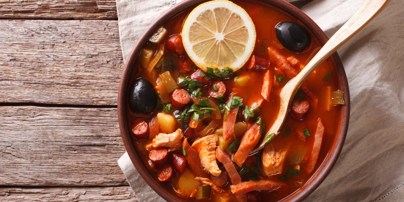 Вкусная, насыщенная, немного кисленькая с неповторимым вкусом копченостей, мясная солянка - это сытное блюдо на любые случаи и отличный вариант обеда в холодное время года. Наш рецепт классической сборной солянки предусматривает свиные ребра, копченую ветчину и охотничьи колбаски.