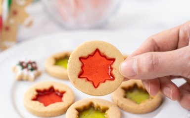 По этому универсальному рецепту можно приготовить несколько видов печенья. Предлагаем приготовить яркое витражное печенье — окошки в котором сделаны из плавленых леденцов и еще другой вид — с густым конфитюром или джемом.