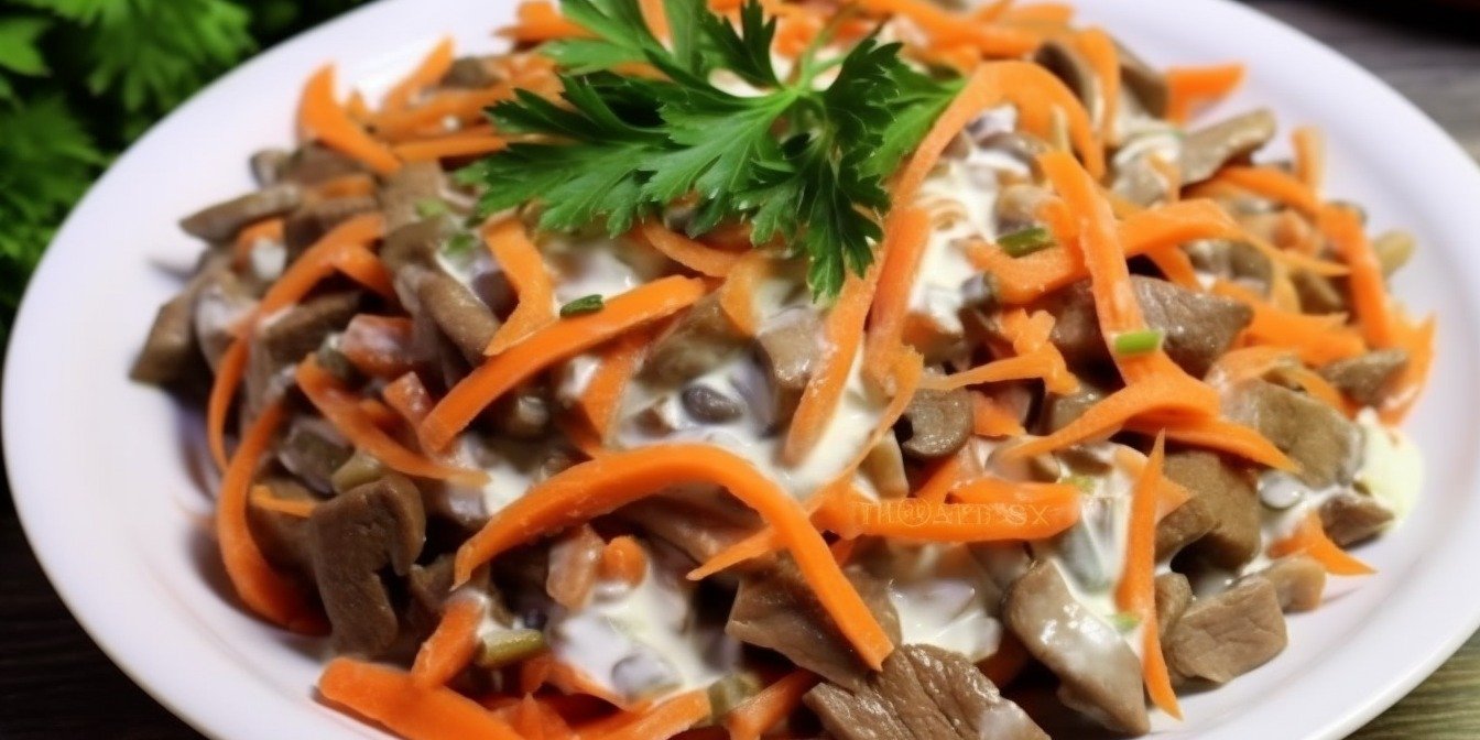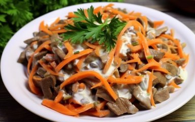 Помимо печени и жареных шампиньонов, для приготовления этого салата вам понадобится уже готовая корейская морковь. Ловите рецепт моркови по-корейски, чтобы долго не искать его!
