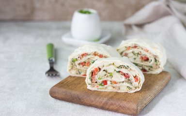 В рецепте автор использует майонез — по этому рецепту вы сможете приготовить домашнюю версию. Советуем готовить сразу двойную порцию, чтобы хватило на все салаты и закуски. Добавьте вашему рулету немного яркости — мелко покрошите петрушку, зеленый лучок и укроп, и слегка присыпьте прослойки лаваша.