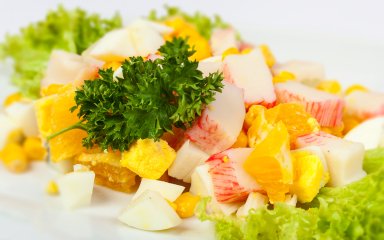 Этот новогодний салат понравится ценителям сладко-соленых сочетаний. Микс крабовых палочек, вареных яиц, консервированной кукурузы и мандаринов под майонезом (советуем приготовить домашний майонез) — это свежая идея для новогоднего праздничного стола.