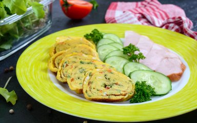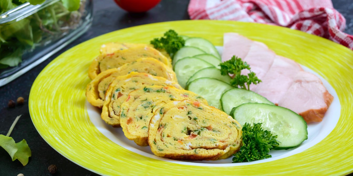 Яичный рулет с начинкой из ветчины и двух видов сыра можно подавать на завтрак или в качестве перекуса. Он готовится очень просто и быстро!