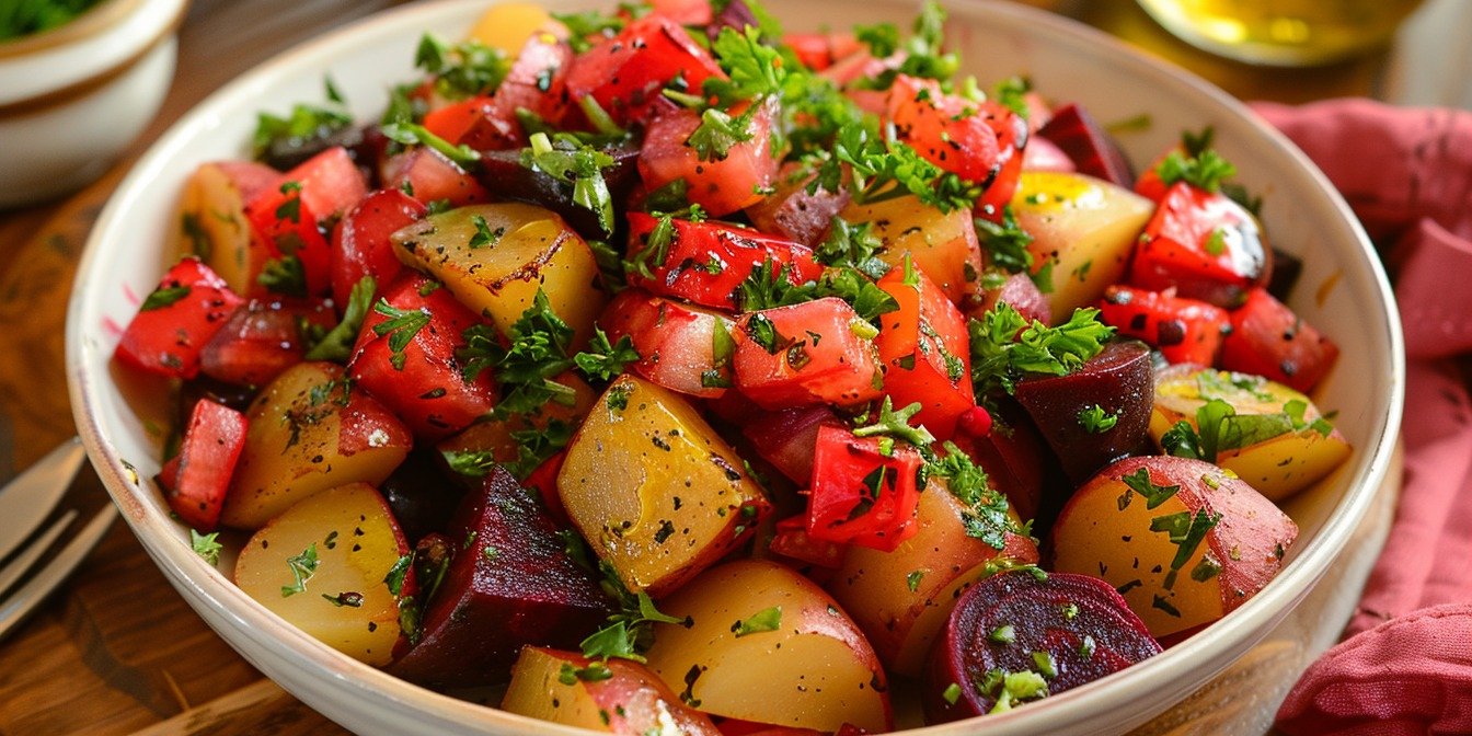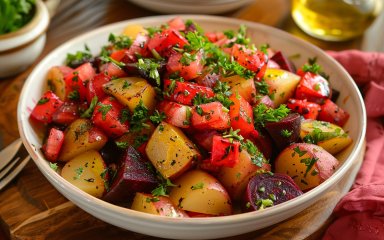 Этот салат из картофеля, свеклы и болгарского перца — простой овощной микс, наполненный полезными витаминами и минералами.