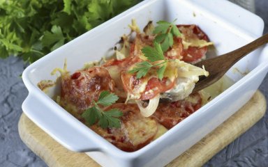 Сочная и нежная белая рыба под овощной шубой — это удовольствие и польза в одном флаконе. Филе запекается на подушке из картофельного пюре под слоями лука и помидоров. Сверху блюдо посыпается тертым сыром. Звучит вкусно, правда?