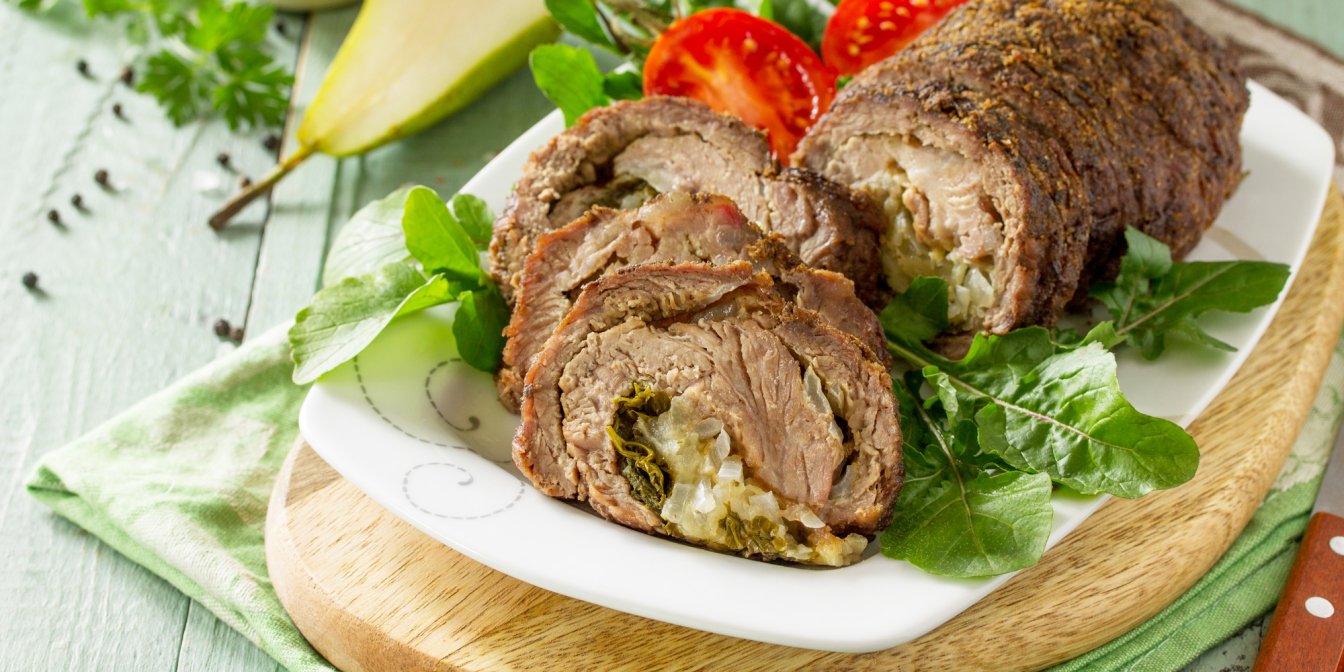 Говядину отбейте в широкий пласт, посередине положите свиной фарш, кубики яйца, измельченную зелень и сверните рулет. Завяжите вокруг ниткой, чтобы не раскрутился.