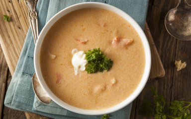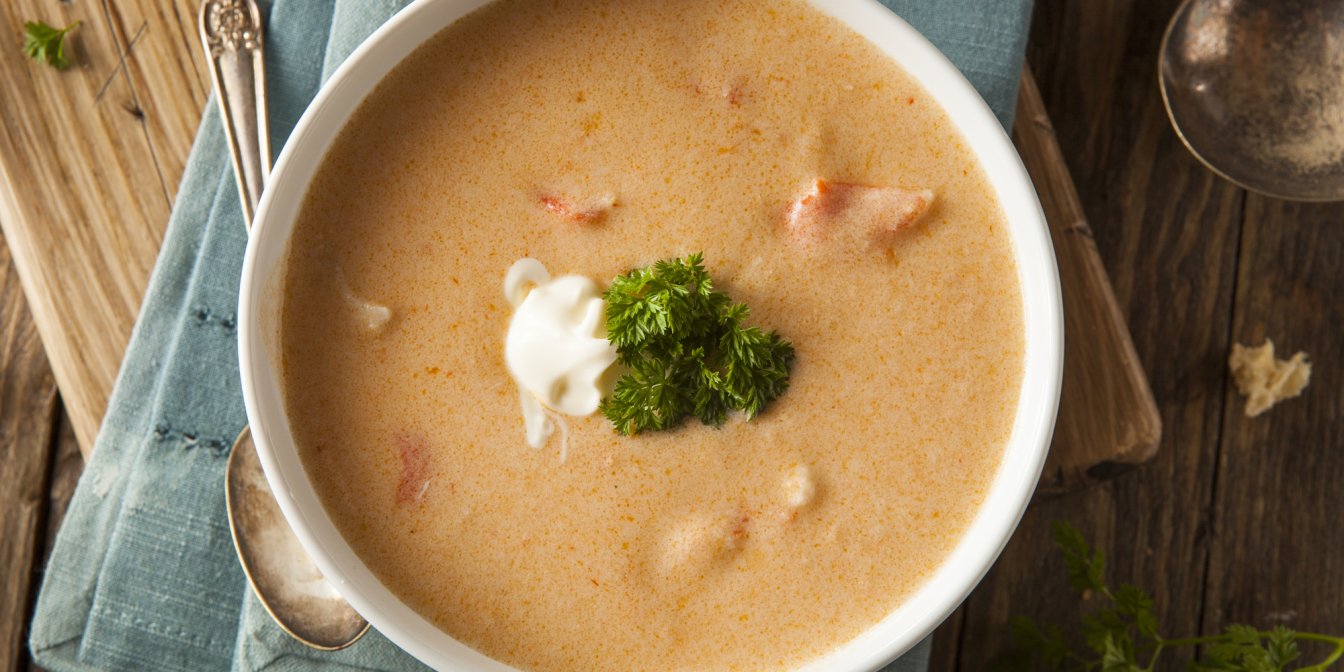 Поставьте суп на средний или слабый огонь и добавьте сливки. Хорошо перемешайте и посолите, если нужно. И следите за тем, чтобы суп не закипел! Подавайте биск с кусочками бекона и поджаренным хлебом.