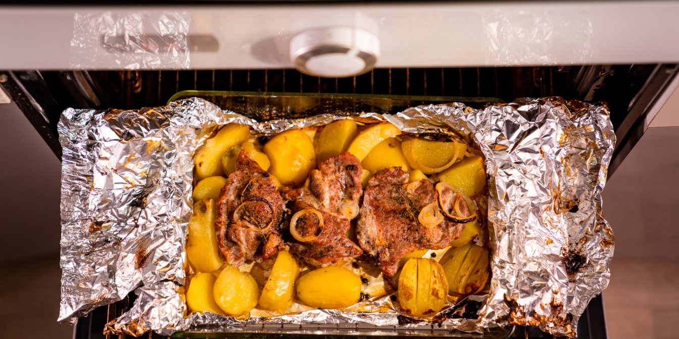 Плотно оберните фольгу вокруг стейка и картофеля и запечатайте все вместе.