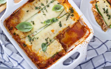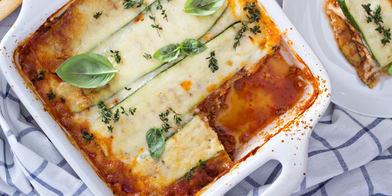 Предлагаем расширить список рецептов лазаньи и заменить тесто на слайсы кабачка. Блюдо получается не менее питательным, но не перегружает желудок. К тому же кабачки — неприхотливый ингредиент, имеют нейтральный вкус и сочетаются с любой начинкой: с помидорами и фаршем или с грибами и шпинатом.