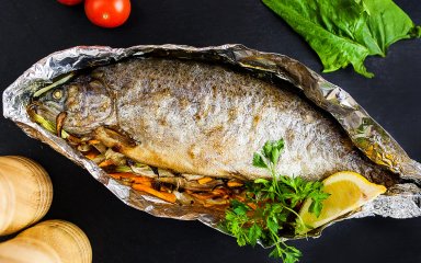Мы предлагаем вам запечь в фольге форель. О пользе этой рыбы можно слагать легенды. Ее мясо богато уникальными жирными кислотами Омега-3 и Омега-6, необходимыми для нормальной работы сердечно-сосудистой системы, они также препятствуют отложению холестериновых бляшек. Питательные компоненты форели нормализуют нервную систему, борются с повышенным давлением и улучшают память.