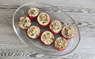 Начините яблоки начинкой, выложите в форму для запекания, накройте крышкой или листом фольги и поставьте в разогретый духовой шкаф на 45-60 минут (зависит от сорта яблок, готовые яблоки легко протыкаются насквозь зубочисткой).