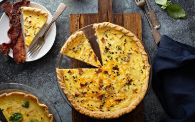 В основе пирога — классическое песочное тесто. А в качестве начинки мы предлагаем смесь из лука, бекона, трав и, конечно же, сыра.