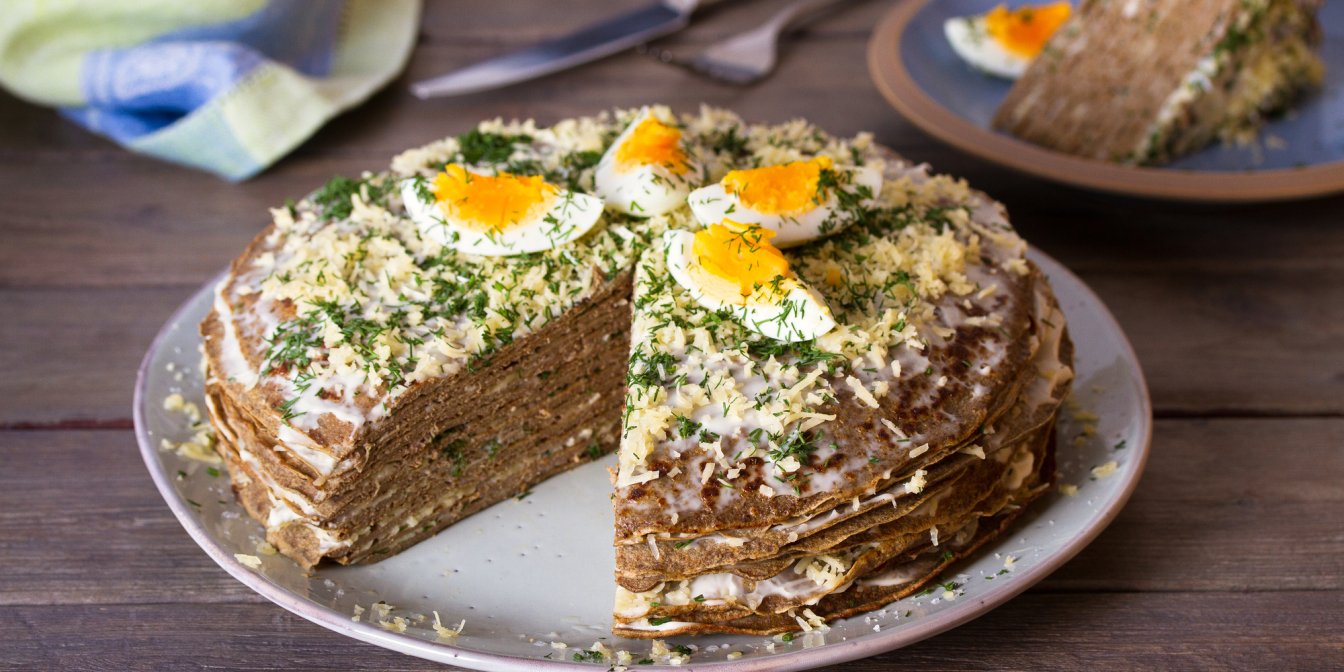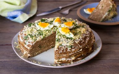Торт из куриной печени станет отличной закуской на праздничном столе, но его можно приготовить и в будни и подать в качестве основного блюда.