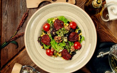 Помойте и нарежьте томат кубиками. Также выложите на тарелку с салатом. А сверху посыпьте измельченными орехами.