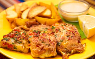Рыбу сначала обваляйте в муке, затем окуните в сырный кляр и обжаривайте примерно 7-8 минут с каждой стороны до золотистой корочки.