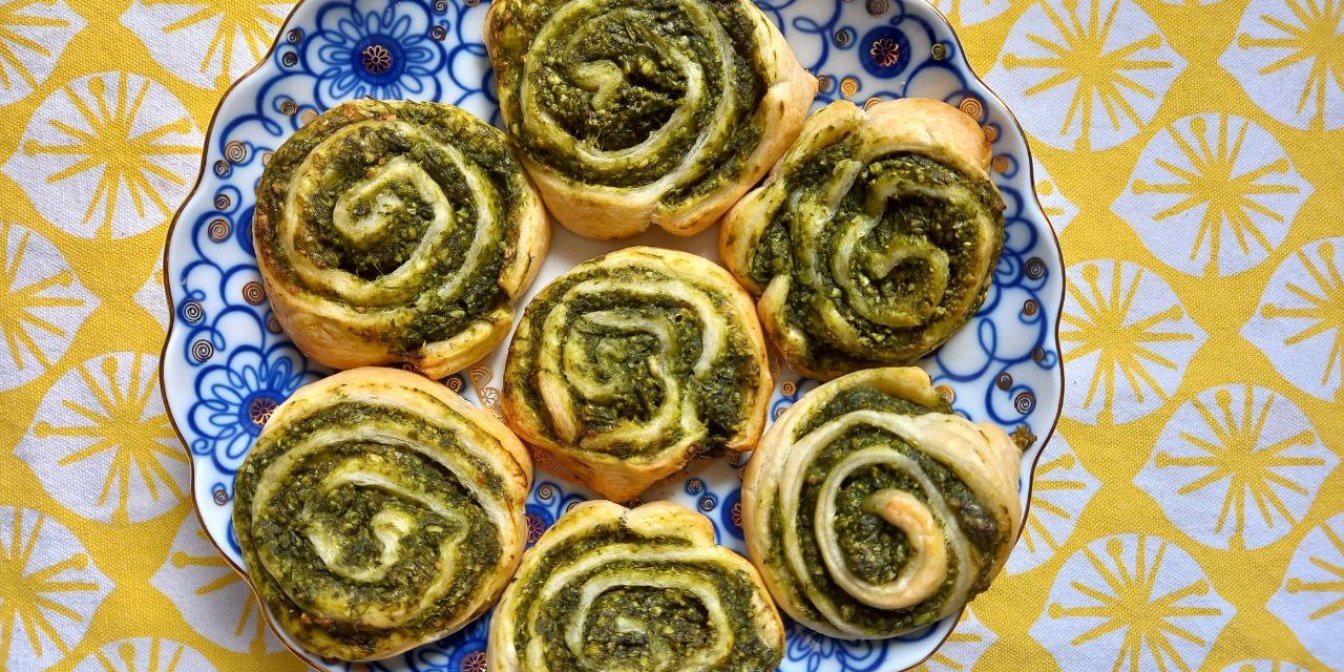 Примечание: используйте свежий или замороженный шпинат и готовое слоеное тесто. Добавляйте специи по вкусу и свежую зелень — укроп, петрушку или рукколу.