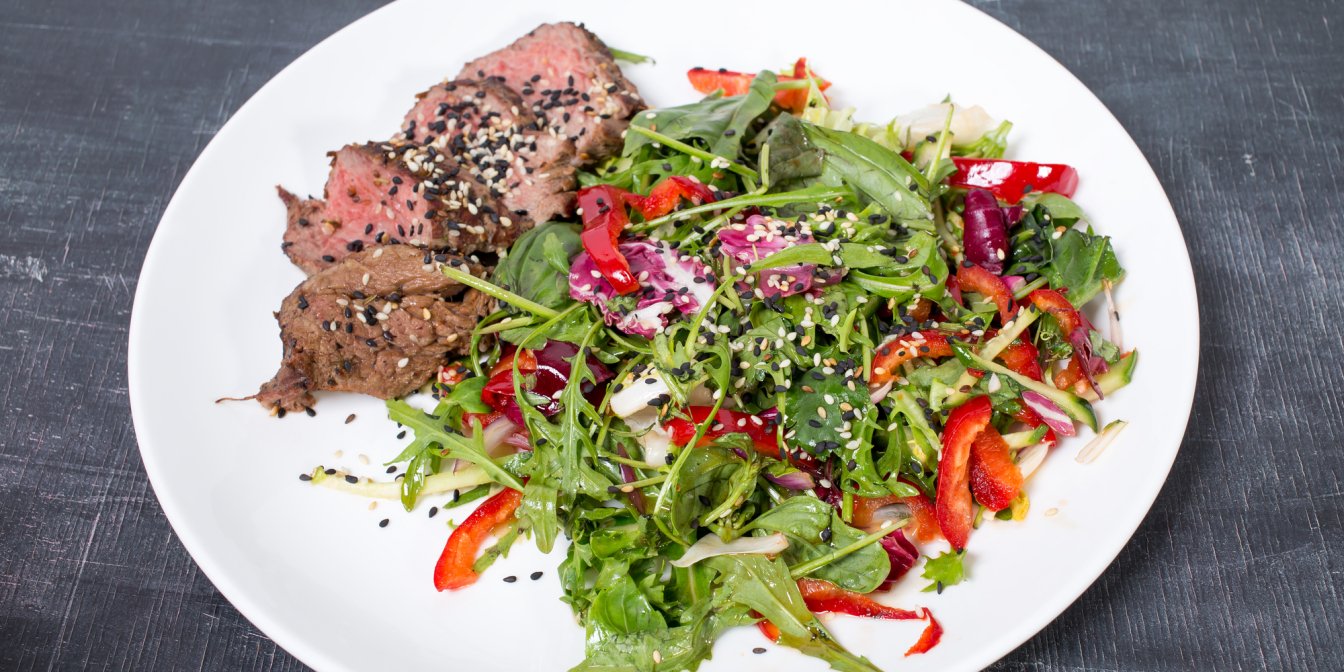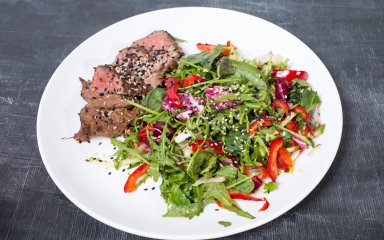 Салат со стейком — это аппетитная и сытная пища, которая готовится из тонких ломтиков обжаренного на сковороде мяса. К столу блюдо подается вместе с руколой, зеленым салатом и лимонным соусом. Также к этому салату можно смело добавить козий сыр, авокадо, зеленый лук и сладкий перец.