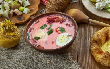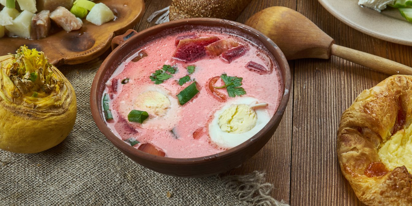Суп аукста, что в переводе с латышского означает «розовый суп», — это красочный праздник любимых летних ингредиентов. Его готовят из свеклы, огурцов, кефира, сваренных вкрутую яиц и мяса.