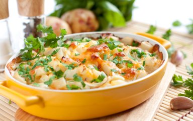 Все самые любимые ингредиенты в одном блюде — разве это не замечательно? А что самое главное — простые. Молодой картофель, немного чеснока и соли для вкуса, мука, молоко и сыр для соуса и сливочное масло для смазывания формы — вот и все, что вам нужно.