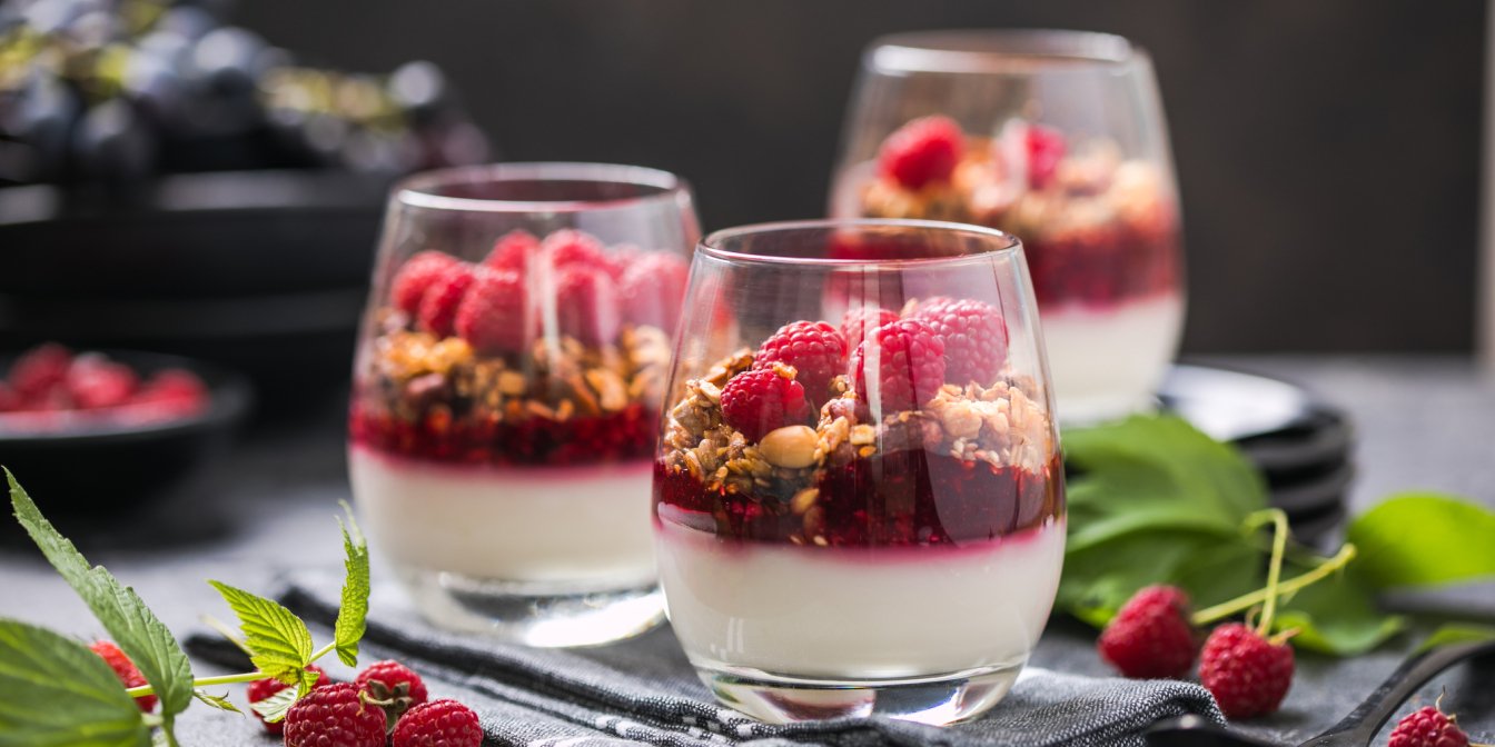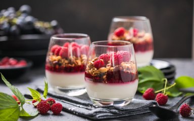 Десерт состоит из трех компонентов: творожного слоя, малинового слоя и декора из гранолы и ягод. Благодаря многослойности, контрасту цветов и стильному украшению, он хорошо впишется в летнюю домашнюю вечеринку по любому случаю.