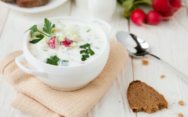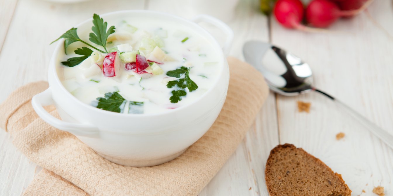 Он легко станет фирменным блюдом лета и хорошим заменителем любимой окрошки. Приготовленный из огурцов, цукини и зелени, политый сверху кефиром и сметаной, украшенный кубиками брынзы, кольцами редиса и сухариками, — это прекрасное начало летнего обеда или ужина.