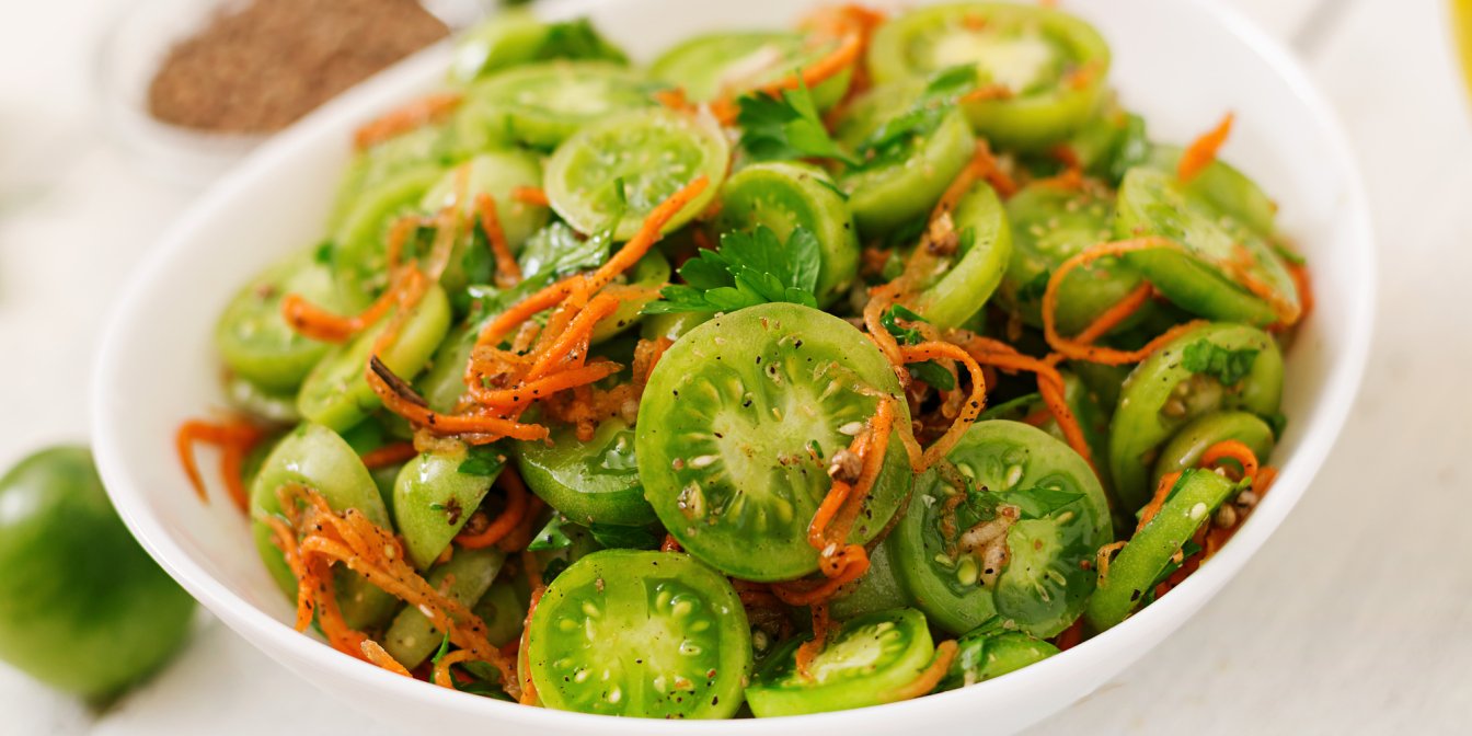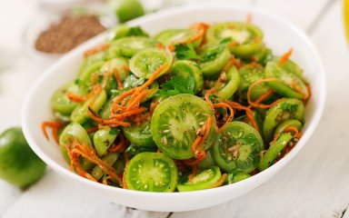 Зеленые помидоры ничем не уступают по пользе обычным красным. Благодаря более твердой структуре становятся отличной закуской. Эти зеленые помидоры по-корейски можно пробовать за 1 час, переложив их в банку с овощной массой из моркови, лука и чеснока.
