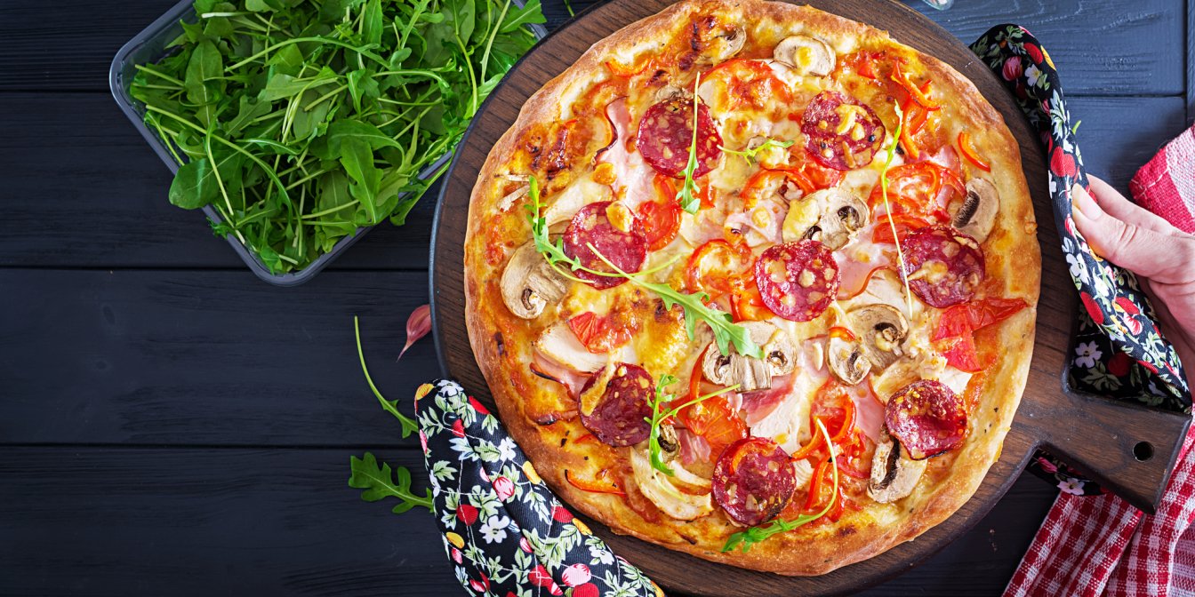 А вот с начинкой пиццы вы можете играть как угодно. У нас это классика — колбаска, помидоры, шампиньоны и сыр, выложенные на соус из сметаны и кетчупа.