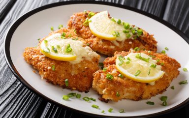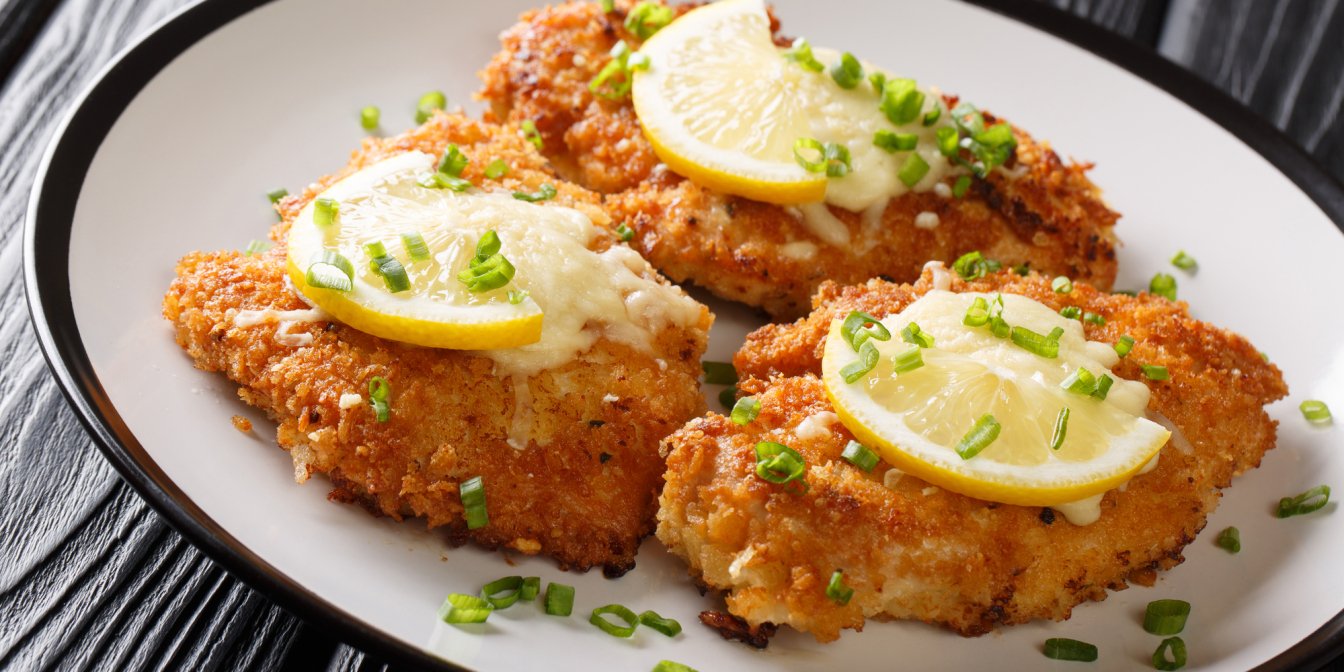 Разогрейте сковороду с растительным маслом и обжарьте запанированные кусочки с двух сторон до румяности. Выложите обжаренную курятину на противень и запекайте в духовке при 180°C 20 минут.