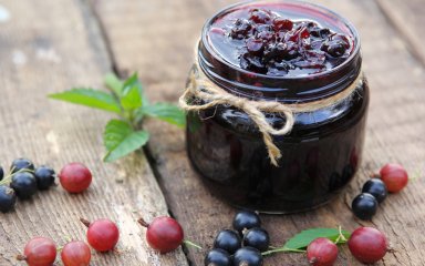 Этот простой джем из крыжовника и черной смородины имеет отличный темно-красный цвет и нежный вкус.