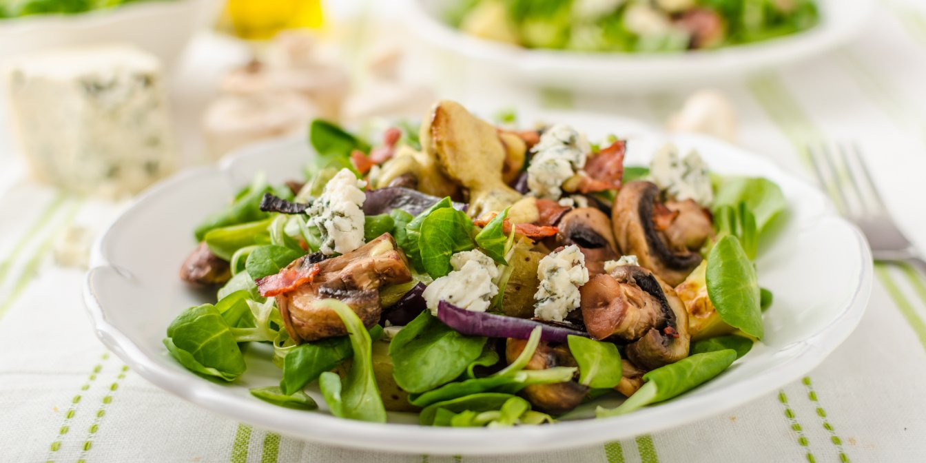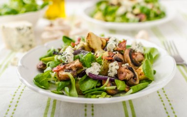 Этот теплый салат — настоящий шедевр из молодого картофеля, смешанного со сладким карамелизованным луком, острой горчичной заправкой, мягким голубым сыром и миксом сезонных листьев салата.