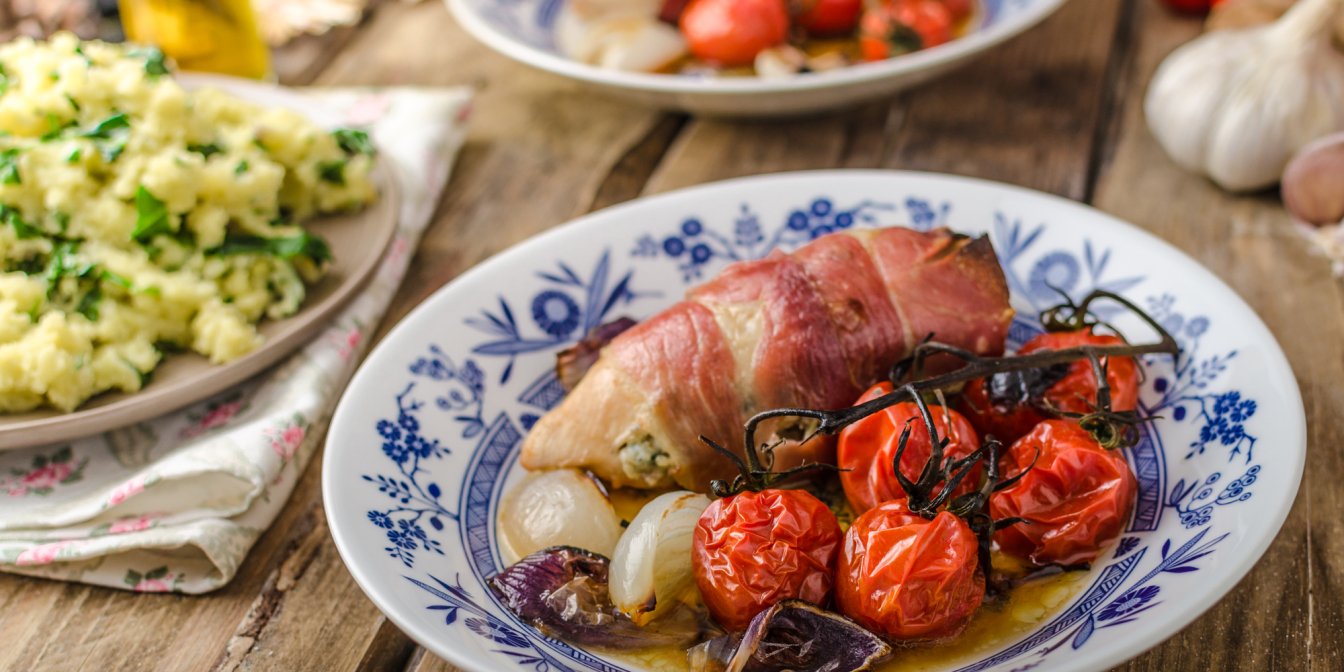 Вкусная курица по рецепту из французского региона Прованс — это ничто иное, как курица, завернутая в слайс бекона. Куриные бедрышки запекаются в духовке вместе с помидорами, а ароматную компанию им составляют лук-шалот и чеснок с тимьяном.