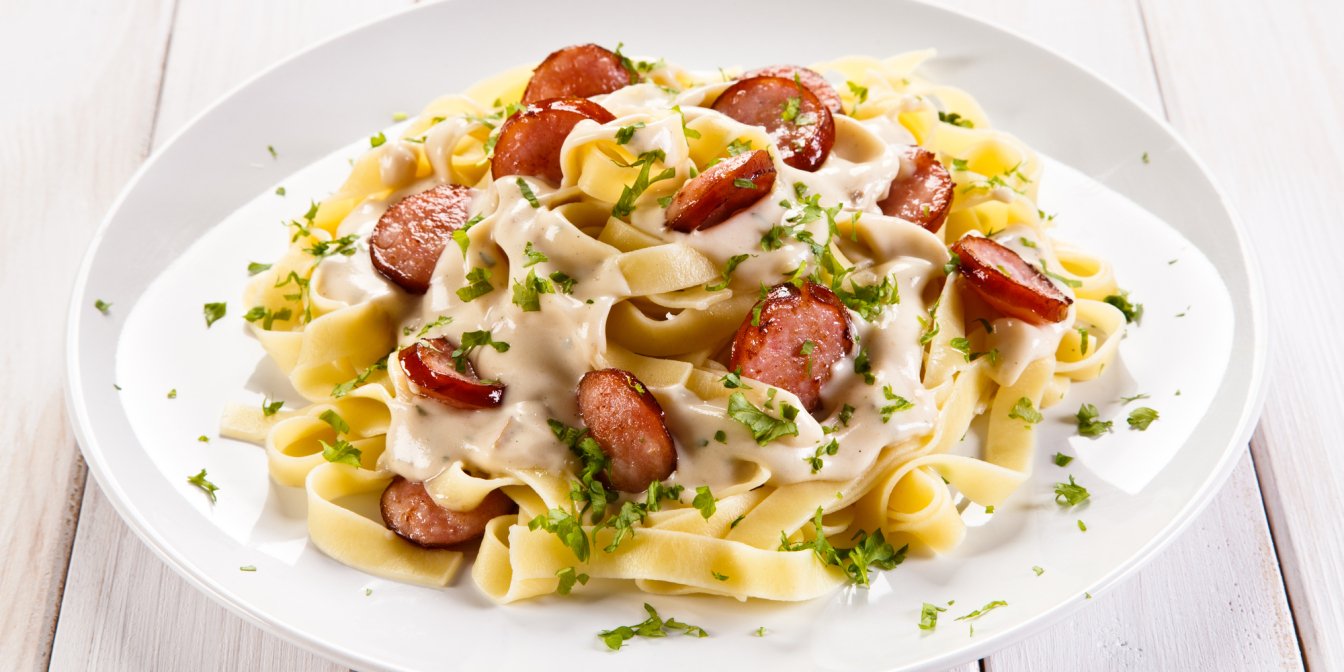 Паста карбонара с колбасками гриль: дачный ужин