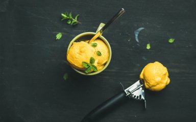 Для приготовления сорбета вы можете взять замороженное манго или же заморозить его самостоятельно. Этот рецепт сорбета особенный тем, что в состав входит лайм и имбирь, балансирующие сладкий вкус манго и добавляющие кислинку.