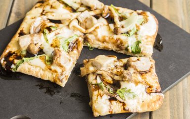 В этой пицце с соусом бешамель есть все, что нужно: сливочная основа, поджаренные с луком грибочки и расплавленный сыр. Так и хочется ее съесть, правда?