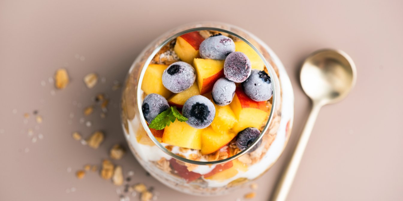 В порционную посуду (например, креманки) выложите гранолу, сверху уложите кусочки персиков и ягоды. Украсьте десерт орешками и листиками мяты.