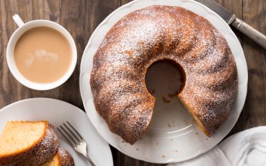 Выньте из духовки и дайте пирогу остыть в форме, прежде чем достать, нарезать и подать. Когда пирог остынет, посыпьте сахарной пудрой и по желанию украсьте фруктами.