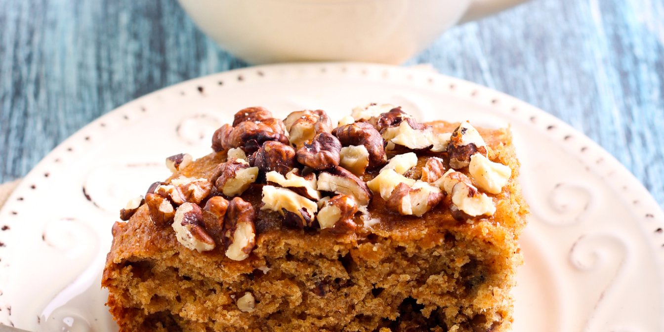 Нарежьте пирог кусочками в форме ромба и подавайте с ореховой половинкой и шариком ванильного мороженого.