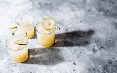 В шейкер налейте джин, абсент, грушевый кальвадос, яблочный сидр, лимонный сок и биттер.