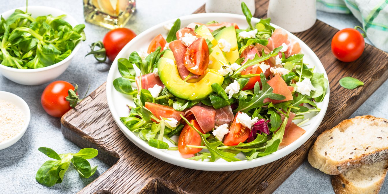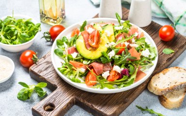 Если вы хотите разнообразить традиционную трапезу, приготовьте этот салат с прошутто, авокадо и сыром с плесенью. Богатая мягкость авокадо в сочетании с соленостью прошутто создает заметный контраст.
