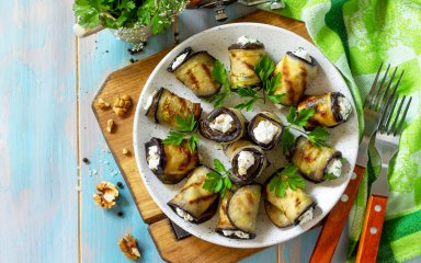 Баклажаны смажьте соусом и скрутите роллом (если полосочками) или положите на них по одной чайной ложке (если кружочки). Подавайте и наслаждайтесь. Приятного аппетита!