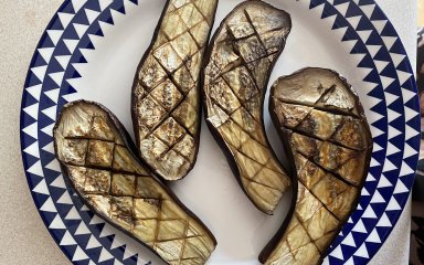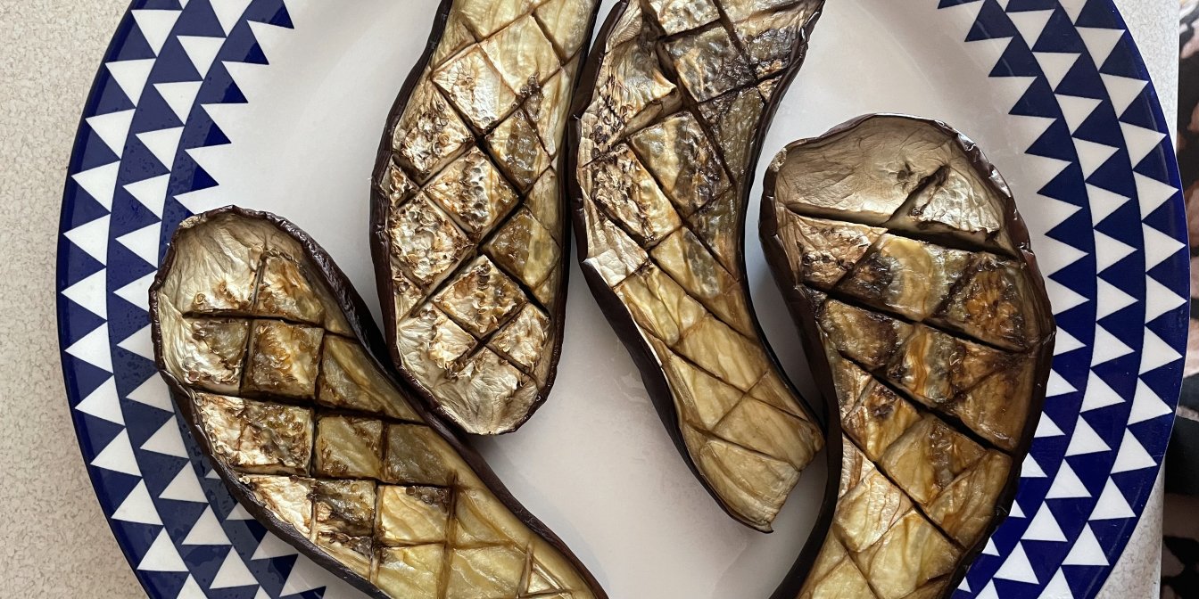 Небольшие баклажаны разрезать пополам, сделать надрезы, полить маслом и отправить в духовку на 30 минут, температура 180 градусов.
