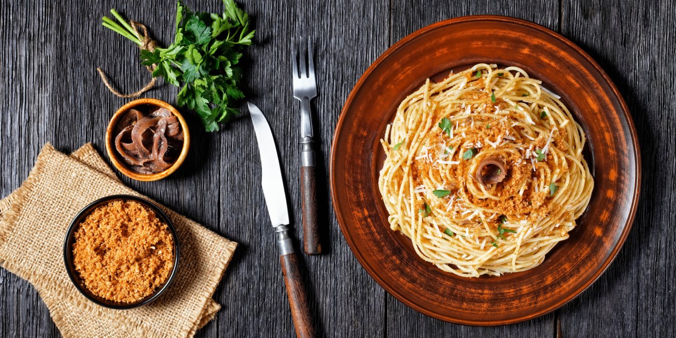 Несколько смазанных маслом анчоусов, свежие панировочные сухари, чеснок, приправы и оливковое масло делают это блюдо из макарон в сицилийском стиле вкусной едой на каждый день. Для приготовления спагетти по этому рецепту требуется менее 30 минут.